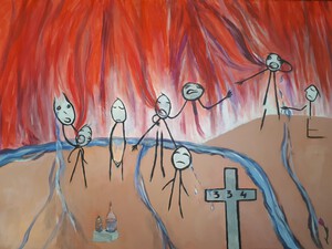 The People/Monsters series is an analysis of the consequences of destructive behaviour on micro ('I'm not that innocent'), meso ('drinking' the 'Cool-aid') and macro level (this painting) The quick sketch I made watching the massive funeral after the hostage drama in Beslan, Russia turned out to be the starting point of a new style of working.
