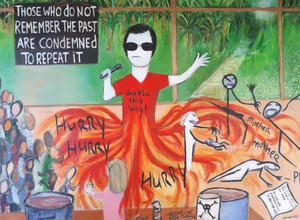 An anonimous letter was found at the Guyana compound after the killings, the request (see letter right bottom of my painting) : tell the story and learn from it, so I'm trying to contribute my own small piece to that.